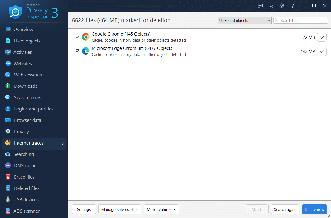 Puede que uses adblockers, VPNs y otros medios para navegar por Internet de forma anónima, ¡pero aún así dejarás rastros sobre términos de búsqueda, entradas de formularios y sitios web visitados en tu PC! Usa Ashampoo Privacy Inspector para revisar no solo tus rastros, sino los de cualquier otra persona que utilice tu ordenador. Aplica filtros para centrarte en lo que es relevante para ti, examina los datos de Chrome, Edge y Firefox con facilidad y elimina todo lo que no quieras que quede registrado.