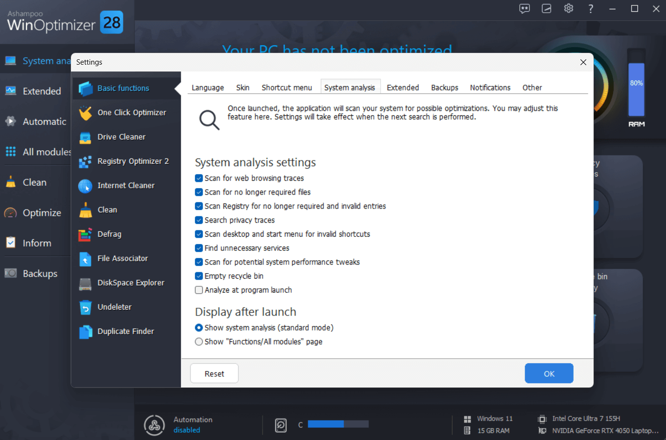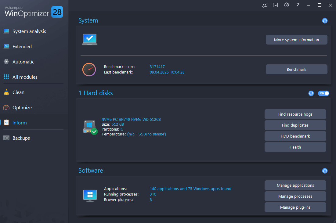 Ashampoo WinOptimizer es un programa de Windows para la optimización del sistema. Elimina datos innecesarios, corrige problemas y mejora la velocidad y la estabilidad del ordenador.