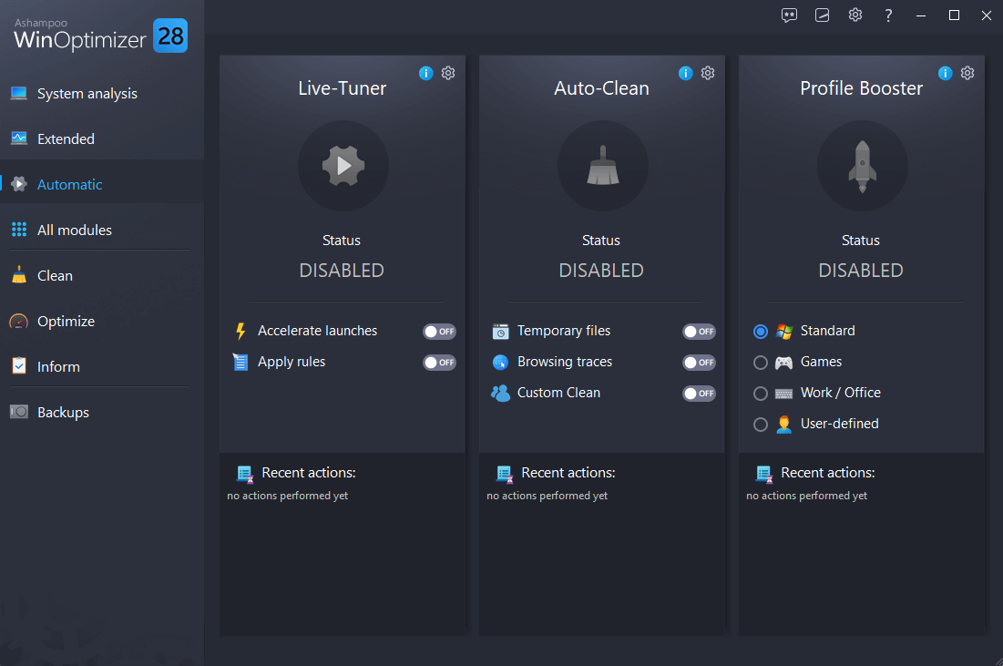 Ningún WinOptimizer se desarrolló de tal manera que incluso los usuarios sin experiencia puedan usar el programa de manera segura y efectiva. Muchas funciones se ejecutan automáticamente o se pueden iniciar con un solo clic. Sin embargo, si lo desea, también puede ajustar ajustes específicos.